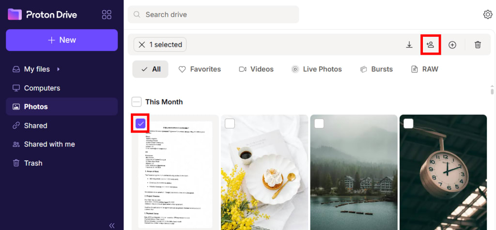 You can create and share albums that stay up to date as you add or remove photos — ideal for events, family albums, group trips, or clients that need to stay in the loop. Here’s how you can do this using the Proton Drive web app: