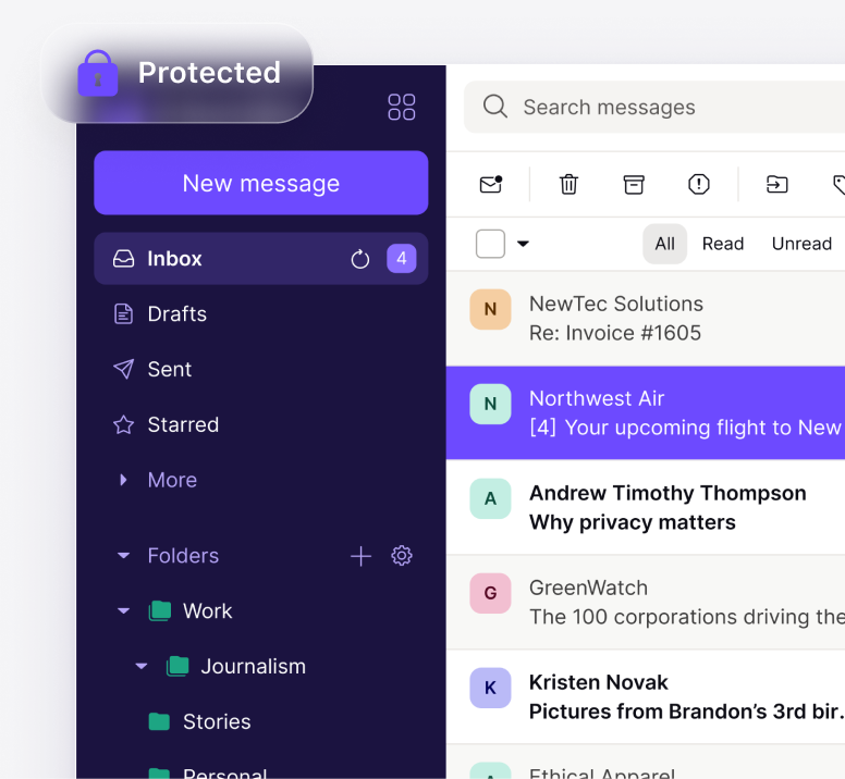 Join millions of users in the fight for online privacy. Get Proton Mail today and be part of an internet that’s built for people, not profit.