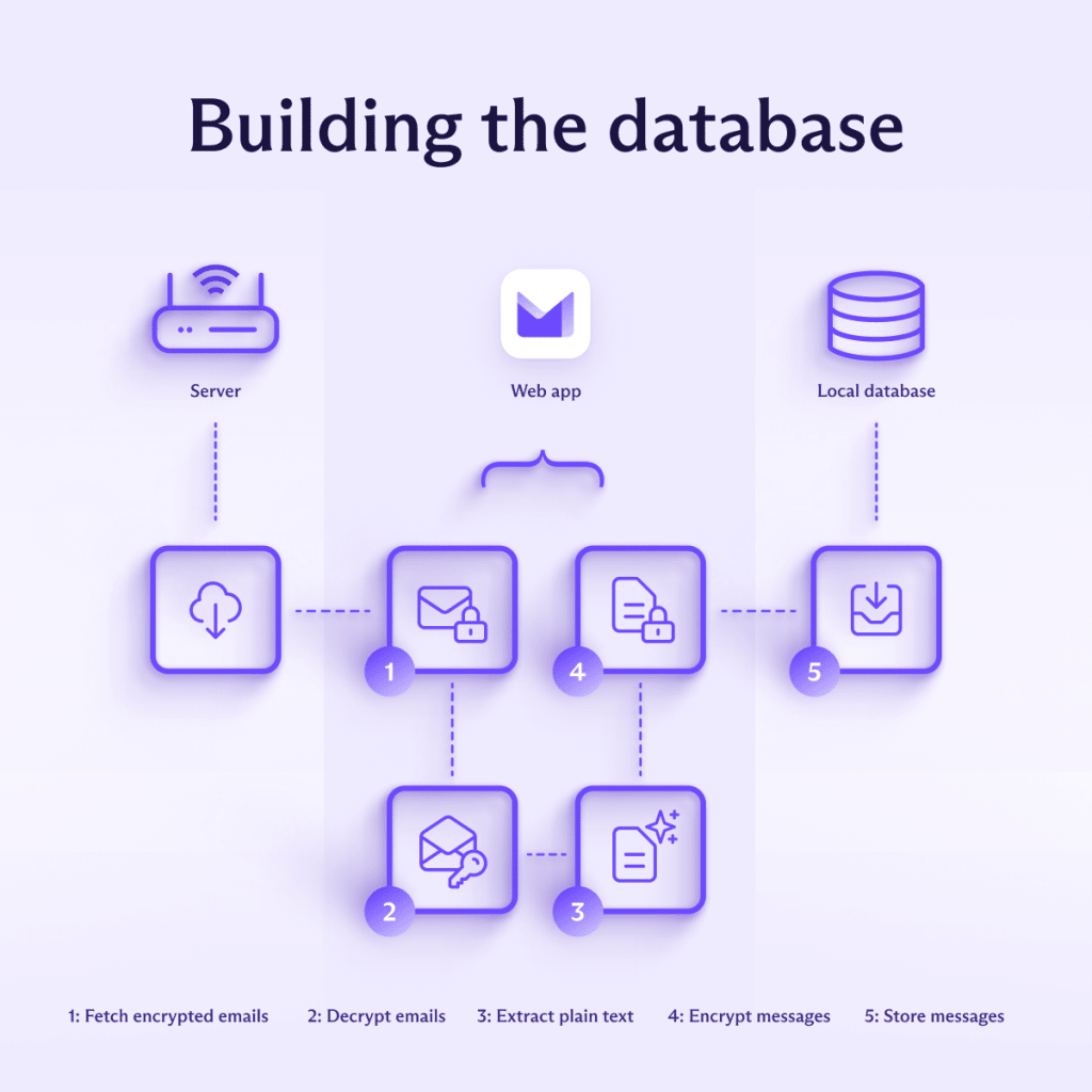 Das Dilemma ist so einfach zu erklären, wie es schwierig zu lösen ist. Bei Proton speichern wir alle Nachrichten in verschlüsseltem Zustand auf unseren Servern, sodass nur der Besitzer des legitimen kryptografischen Schlüssels darauf zugreifen kann. Da Proton-Server keinen Zugriff auf die Schlüssel haben, können wir deine E-Mails nicht entschlüsseln, was bedeutet, dass wir ihren Inhalt nicht durchsuchen können. Andererseits können Proton-Web- und Mobil-Apps auf entschlüsselte Nachrichten zugreifen, haben jedoch in der Regel keinen vollständigen Überblick über das gesamte Postfach, da sie Nachrichten nur dann abrufen, wenn der Nutzer mit ihnen interagiert.