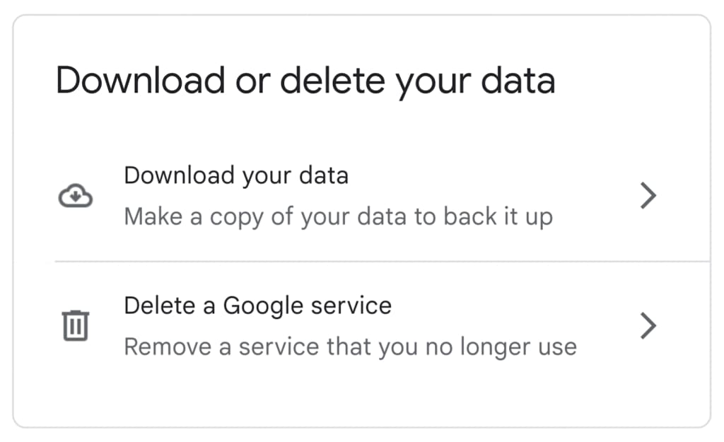 - In the Download or delete your data section, select Delete a Google service and enter your login credentials for verification.