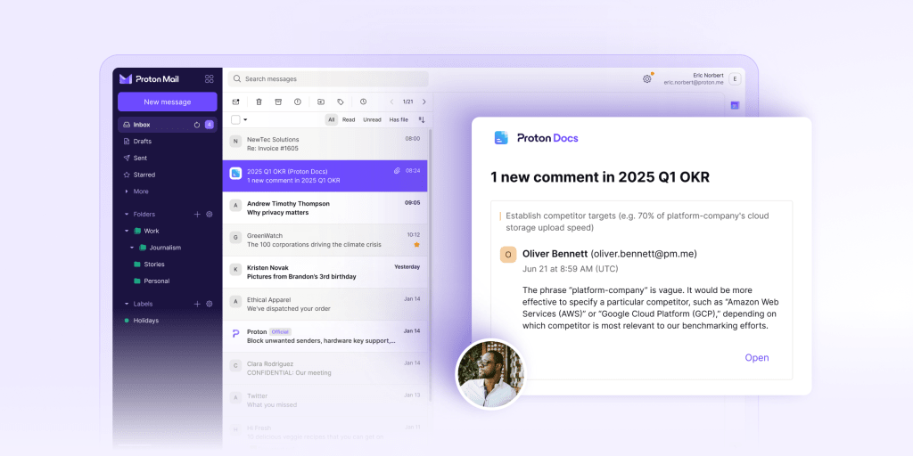 Proton Drive’s latest updates offer new ways to empower your work without compromising your data or productivity. You can now: Collaborate on files, folders, and documents with anyone — even if they don’t have a Proton Account and receive email notifications so you never miss an update in Docs in Proton Drive.