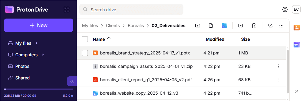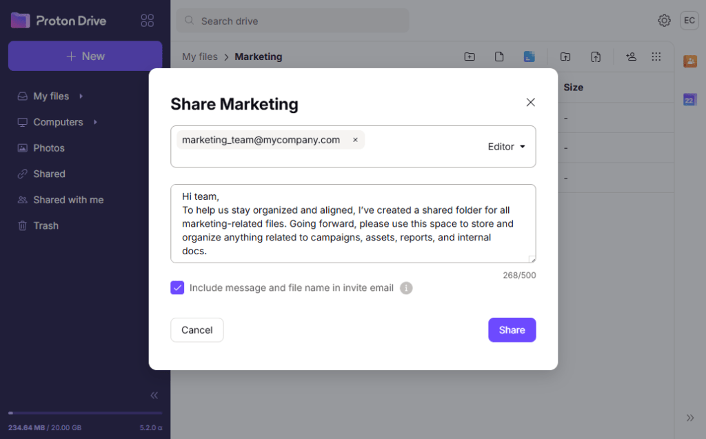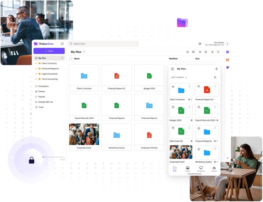 Proton Drive provides a privacy-first cloud storage where your team can safely organize, manage, and share files with stakeholders. Your files are automatically protected by end-to-end encryption, so no one can see your data besides you and those you choose to share files with — not even us.
