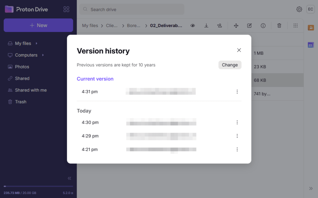 Proton Drive is more than a file management app — it also saves file versions automatically as you work, allowing you to restore previous versions for up to 10 years.