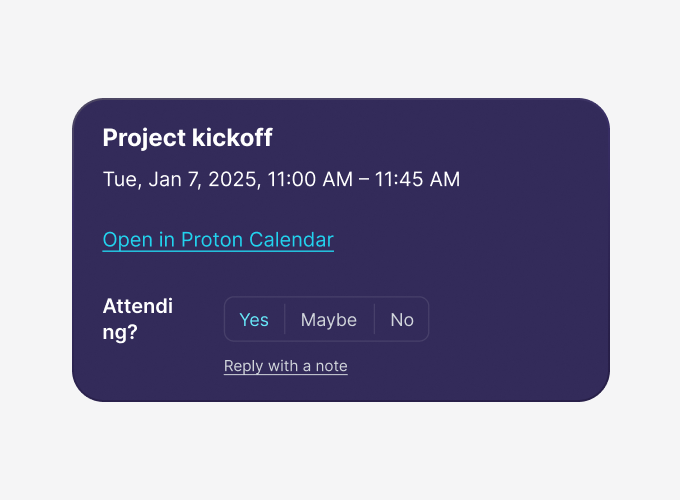 Envoyez et recevez des invitations à des événements pour vos coéquipiers et vos clients tout en gardant les détails entre vous et vos invités grâce au calendrier intégré de Proton Mail.
