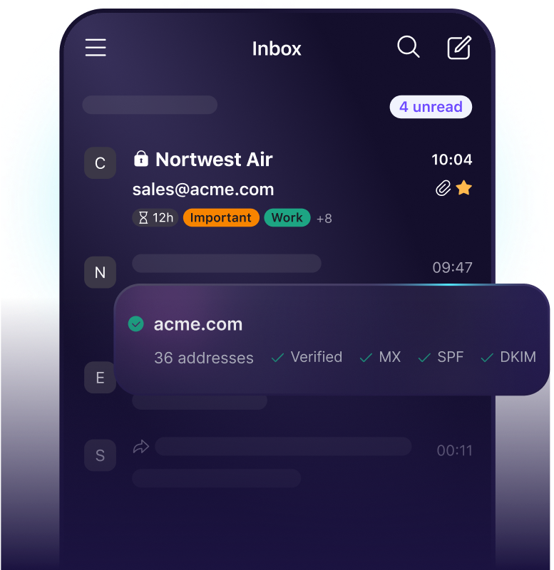 Augmentez votre crédibilité avec un domaine d'e-mail personnalisé et un fournisseur qui protège les données de l'entreprise et des clients contre les violations, la surveillance et l'entraînement de l'IA.