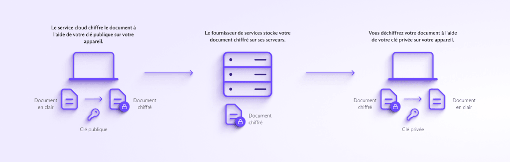 - Maintenant, le document chiffré peut être transmis au serveur pour stockage. Si vous souhaitez y accéder plus tard, vous pouvez vous connecter à votre compte et récupérer le document, le déchiffrant sur votre appareil à l’aide de votre clé privée.