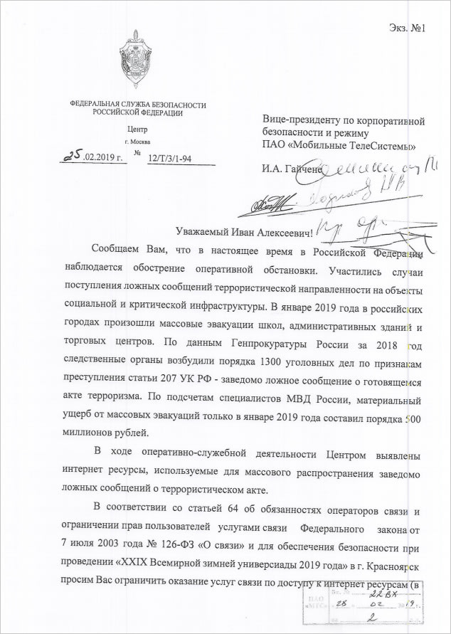 On Monday, a firm called TechMedia obtained a copy of the letter(nuova finestra) and published it on the Russian tech blogging platform Habr. The FSB said the block was a response to fake terrorist threats. In January and February, (nuova finestra)false bomb threats(nuova finestra) in Russia led to the evacuation of tens of thousands of people from schools, rail stations, shopping centers, and offices.