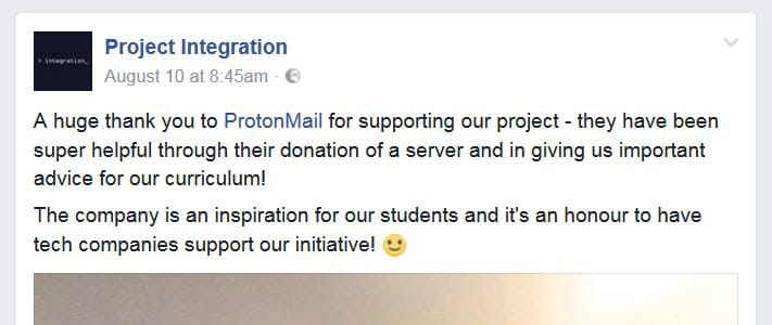 Looking back, we know that community driven efforts can in fact succeed and grow to change the world. Indeed, Proton Mail’s 2014 crowdfunding campaign reached five times our fundraising goal and helped us further develop our vision. Project Integration is looking to do the same and has started a crowdfunding campaign to help fund their courses for refugees. You can get involved with Project Integration through their crowdfunding campaign here(nieuw venster).