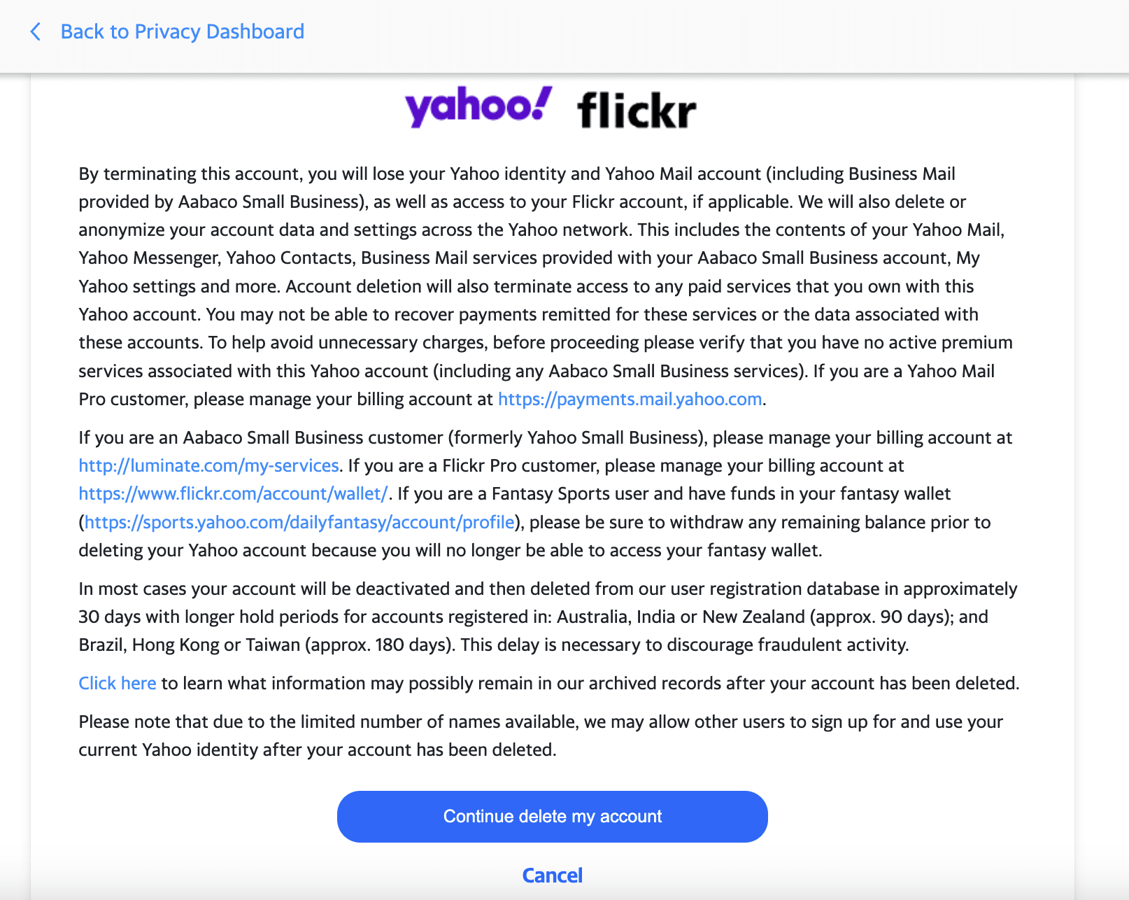 Deletion won’t happen overnight. In most cases, Yahoo will deactivate your account first and then delete it in approximately 30 days. But accounts registered in certain countries may take longer: In Australia, India, or New Zealand, for example, it will take 90 days. In Brazil, Hong Kong, or Taiwan, it will take 180 days.