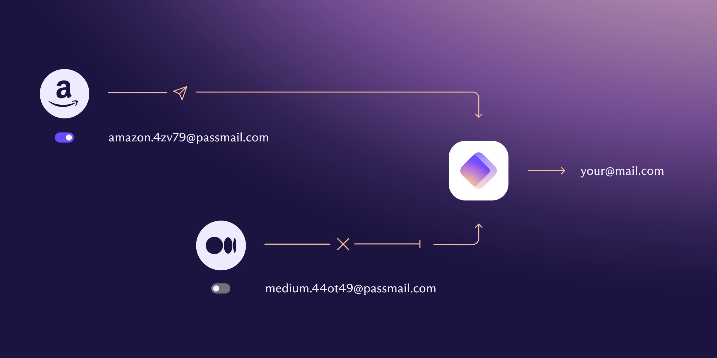 An email alias is a randomly generated email address that sits between a third party (like Amazon, Facebook, or Netflix) and your real email account. Not only does this prevent the third party from identifying who you are, but it filters out trackers and other marketing tools before forwarding the messages to your main inbox.