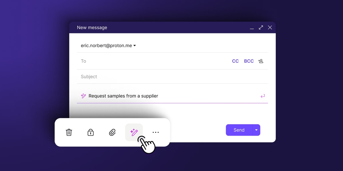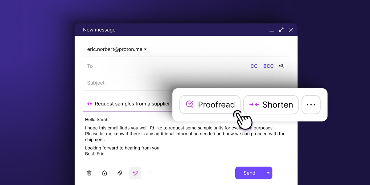 Proton Scribe starts the writing process so you don’t have to face a blank page. Whether you’re reaching out to plan a team event or kicking off a big project, Proton Scribe will save you the time and effort you would have spent writing that first draft. Your emails will be professional and polished — even if your first language is not English.