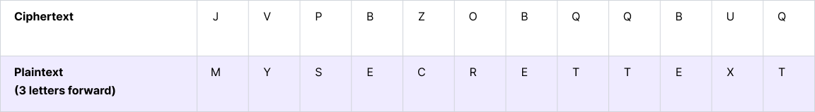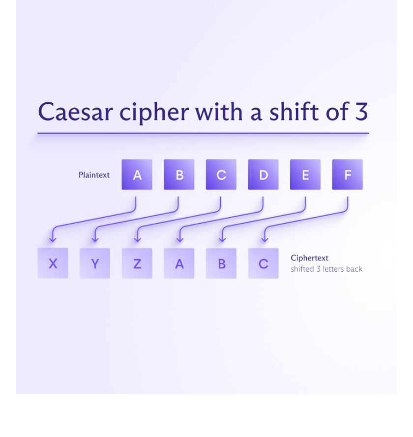 An example of ciphertext created with a Caesar cipher is JV PBZOBQ QBUQ. In this case, each letter of the original message was shifted three letters backward in the alphabet to hide the meaning:
