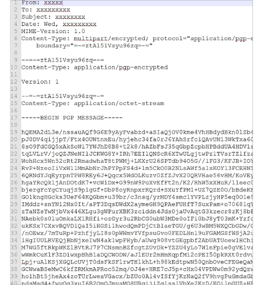 Proton Mail uses end-to-end encryption to protect your messages. While your emails appear readable when you send and receive them, that’s because your device has the correct encryption keys to convert the ciphertext back into plaintext. If anyone attempted to intercept your messages in transit — including Proton itself — they wouldn’t see the actual contents of your email, only encrypted ciphertext like the example below.