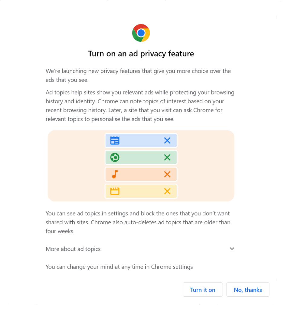 You might have seen this “ad privacy feature” in Chrome via a popup inviting you to turn on “ad topics”, which allegedly protects your browsing history and identity. (In some regions, the feature is opt-out(новое окно).) In fact, the feature doesn’t offer any privacy whatsoever and does not prevent Google from tracking and identifying you.