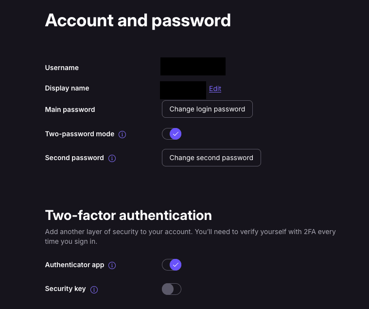 To set up two-password mode and 2FA for your Proton Pass account, select ⚙ Settings and then Account.