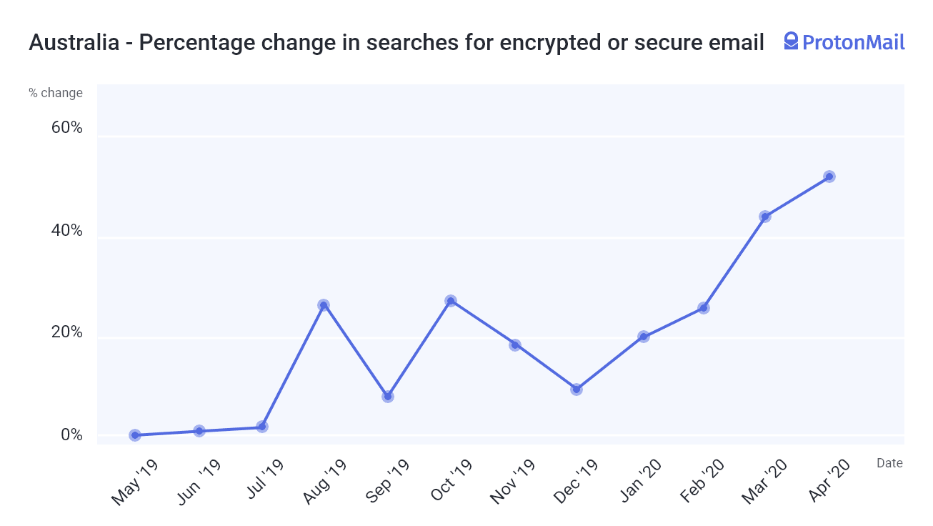 In Australia, searches for privacy-focused Gmail alternatives are up 52 percent. This increased interest in a secure inbox is likely motivated, at least partially, by the passage of the anti-encryption Assistance and Access Bill at the end of 2018.