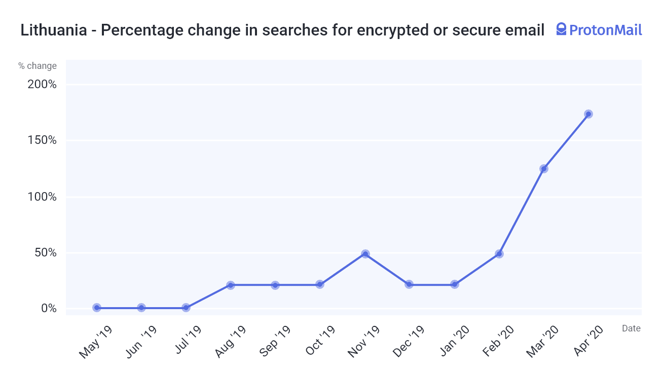 The country that registered the highest increase (at least in our study) was Lithuania. Google searches for privacy-focused Gmail alternatives are up 172 percent among Lithuanians. Their proximity to Russia, which has a history of hacking its infrastructure(new window), might explain Lithuanians’ interest in private email(new window).