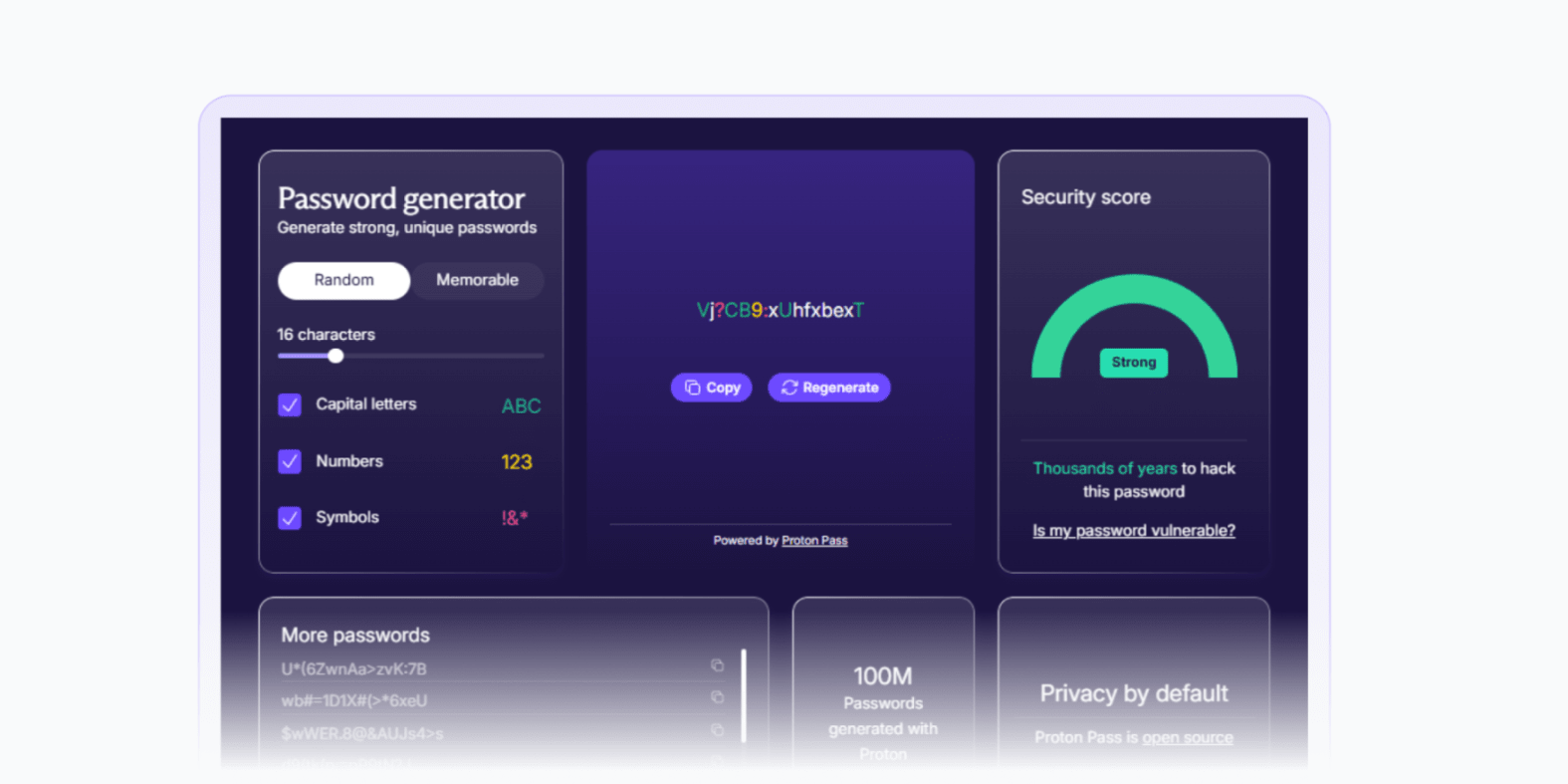 When signing up for a Proton Account, you can use our password generator to create a secure, hard-to-guess password — and set up 2FA using authenticator app or a physical security key to verify your identity at login.