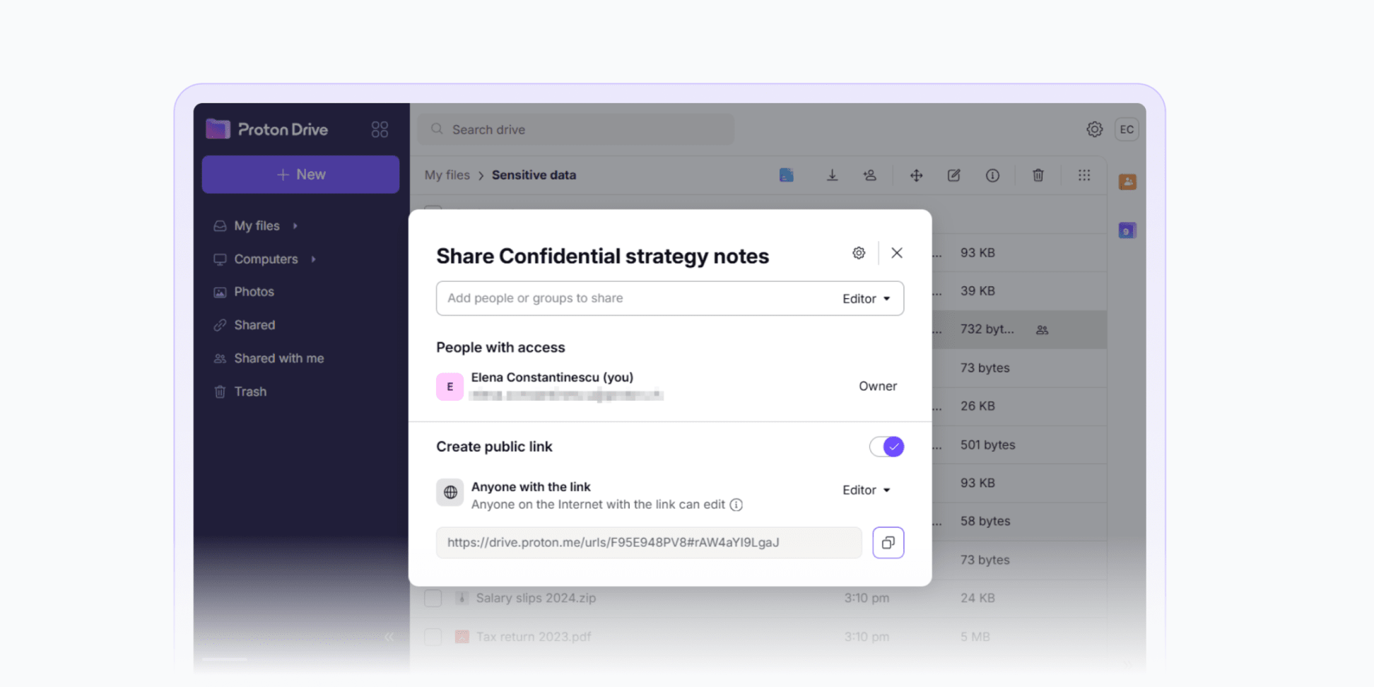 Proton Drive lets you generate secure public links, protect them with passwords, and set expiry dates. For greater control, you can share files privately via email invites, ensuring that only specific people or groups can access them.