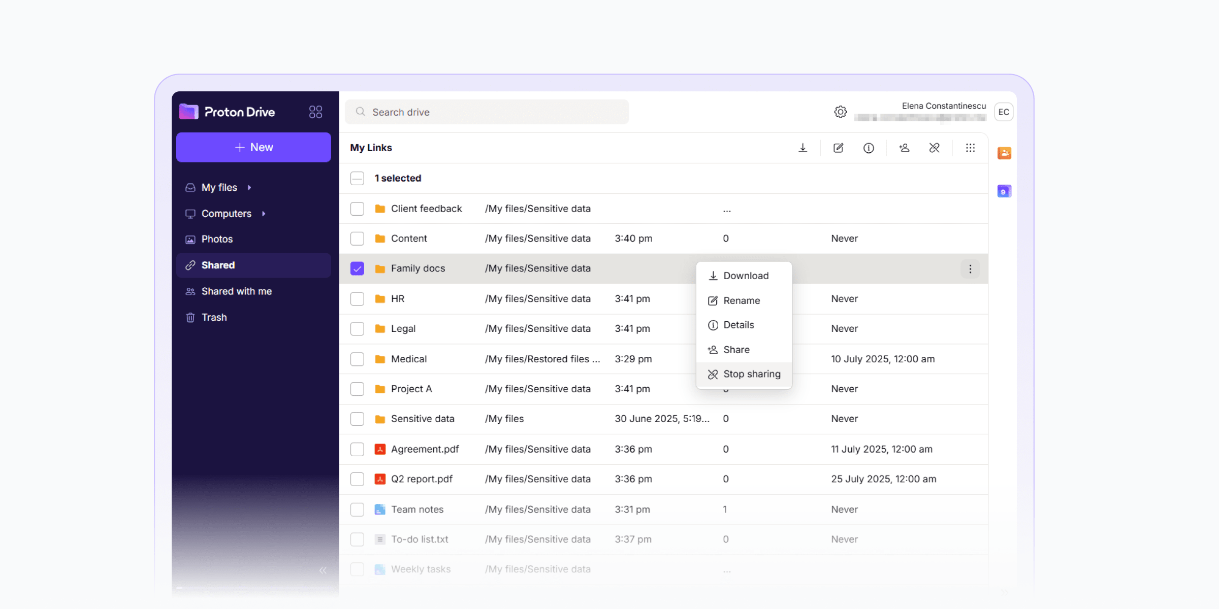 It’s important to remain in control after sharing sensitive information. Proton Drive makes this easy by grouping all your shared files in a dedicated Shared tab(new window), so you can quickly see what you’ve shared.