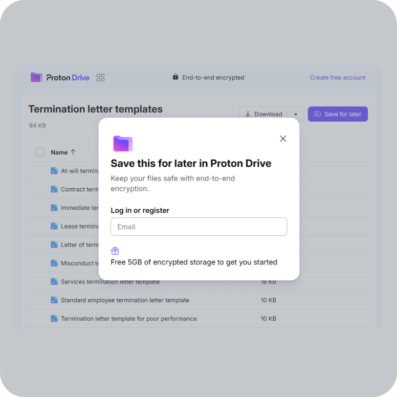 With our cloud storage for business, you can easily customize and share termination letter templates. Create a Proton Drive account and collaborate securely with your team.