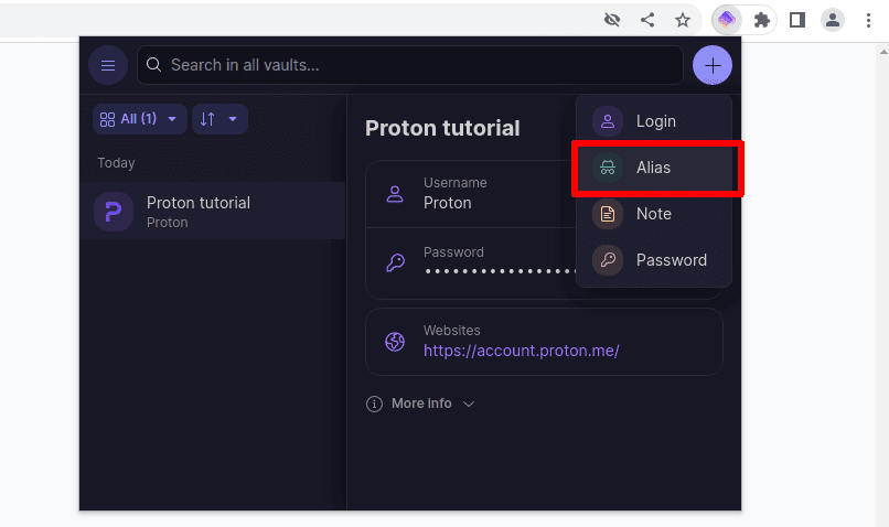 - Click the email address field and open the browser extension → + (Add new item) → Alias.