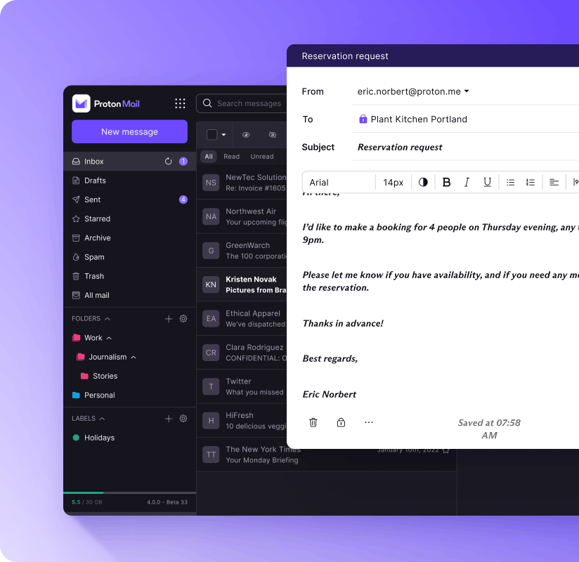 Access Proton Mail and Proton Calendar from macOS, Windows, or Linux (beta). Or use our web app(new window) with your favorite web browser.
