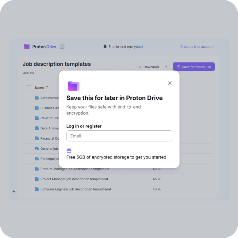 3. Log in or sign up for a Proton Account. The document will be instantly added to your business cloud storage, so you can edit it right away.