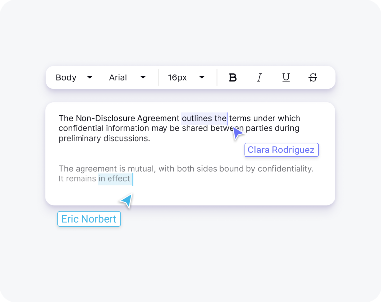 Invite clients and team members to contribute to a single working document. Suggest and Edit modes, comments, and cursor tracking keep everyone on the same page.