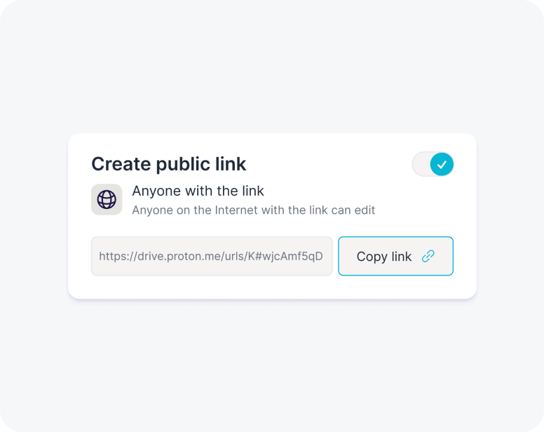 Share securely by email or through a public link, with passwords and expiry dates. You can revoke access anytime — everything stays safe with end-to-end encryption.
