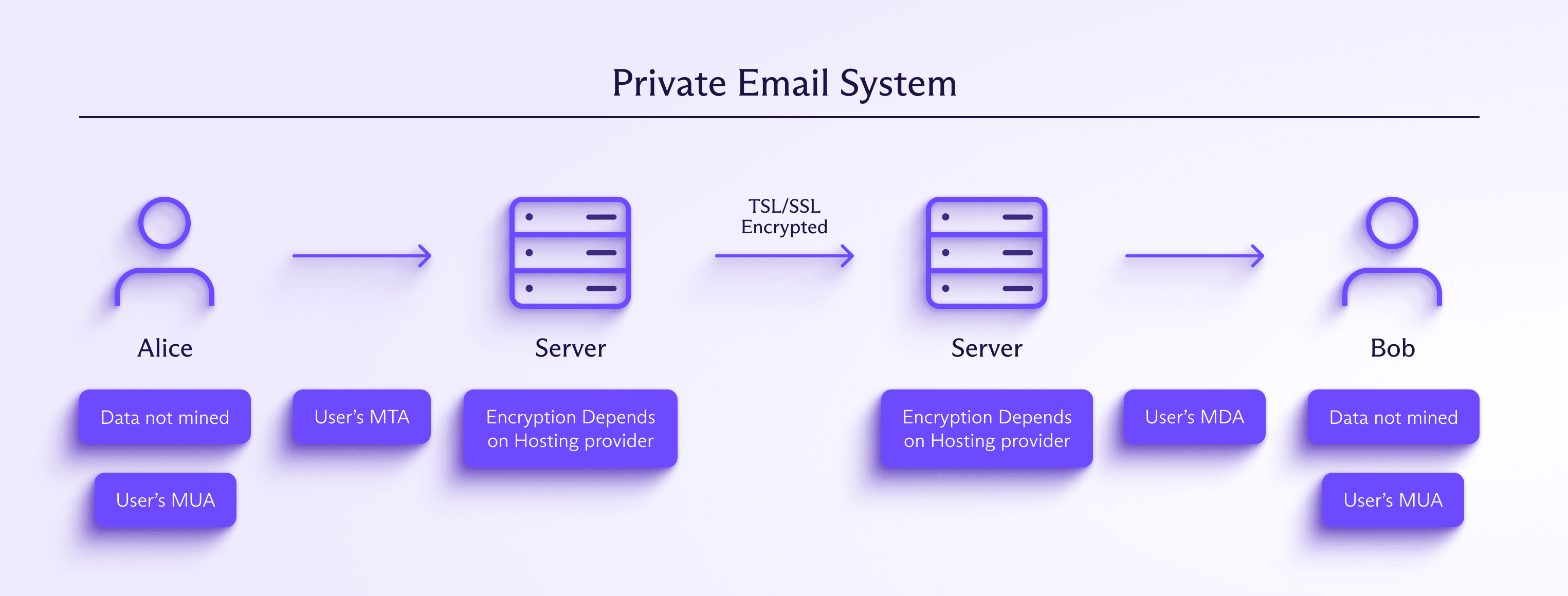 Níže jsou uvedeny tři diagramy ilustrující způsob, jakým je nakládáno s daty v různých e-mailových systémech. První ukazuje, jak společnosti Big Tech snadno přistupují k vašim datům. Druhý ukazuje implementaci Proton Mailu, která šifruje e-mailové zprávy lokálně před jejich odesláním na server. A třetí zobrazuje typické nastavení soukromého e-mailového serveru, které zachovává soukromí na úkor bezpečnosti, protože e-maily nejsou ve výchozím nastavení koncově šifrovány.