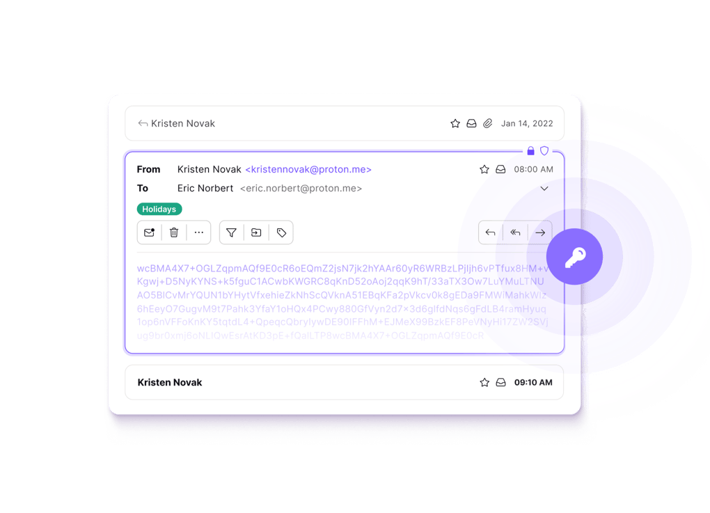 Díky šifrovanému e-mailu od Proton Mail udržuje šifrování s nulovým přístupem všechny vaše uložené e-maily na našich serverech v soukromí. Posílejte zabezpečené zprávy komukoli pomocí koncového šifrování a e-mailů chráněných heslem.