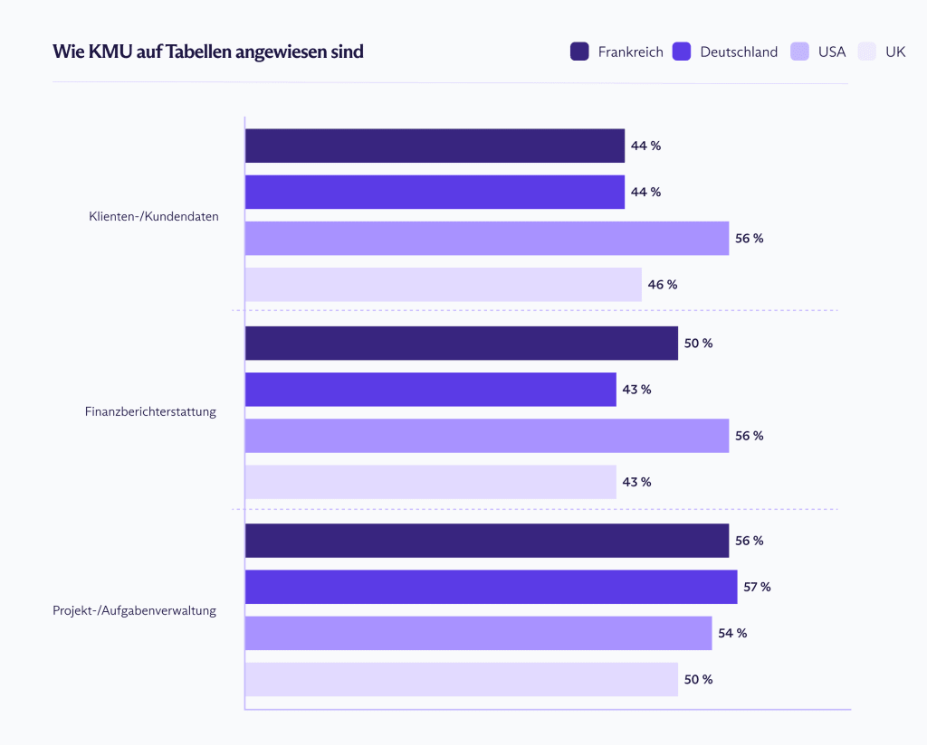 Wir haben KMU-Führungskräfte in den USA, Großbritannien, Deutschland und Frankreich dazu befragt, wie sie ihre Tabellen nutzen – und schützen. Alle waren kleine Unternehmen (mit unter 100 Mitarbeitern), was sie besonders anfällig für Hacking- und Ransomware-Angriffe macht.