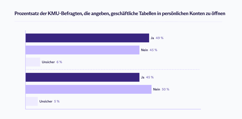 In den USA gaben über zwei Drittel der Befragten an, noch immer Zugriff auf Tabellen oder geteilte Dokumente zu haben, die sie nicht mehr benötigen. Und in Frankreich sagte fast jeder Vierte, beim Teilen von Tabellen „Jeder mit dem Link kann anzeigen“ zu verwenden, was bedeutet, dass der Zugriff bestehen bleibt, selbst wenn du dich nicht mehr erinnerst, wer den Link hat.