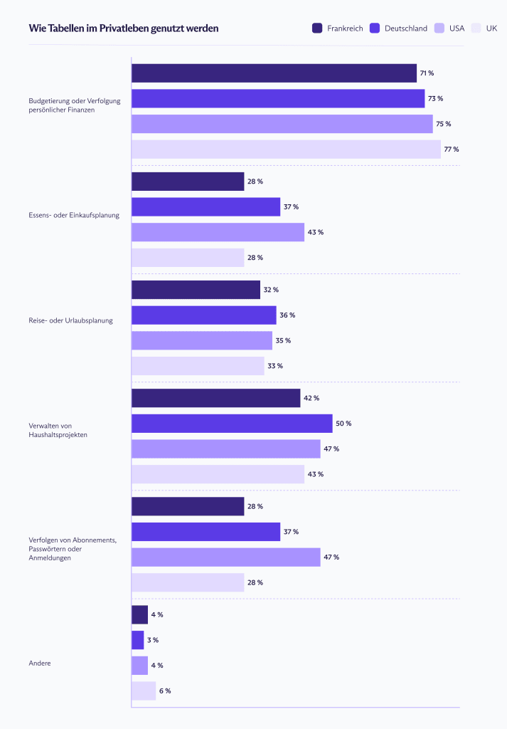 Länderübergreifend nutzen 71–77 % der Menschen Tabellen für Budgetierung und persönliche Finanzen. In den USA erfasst fast die Hälfte (47 %) Informationen zu Abonnements oder Logins. In Deutschland sind Tabellen zu den wichtigsten Tools zum Verwalten von Haushaltsprojekten geworden (49 %).