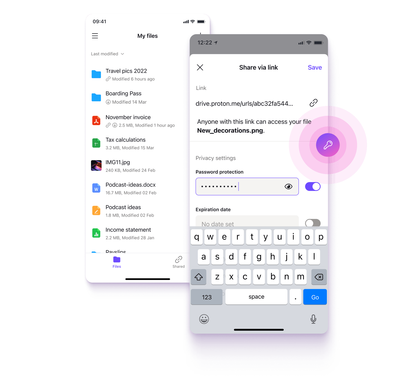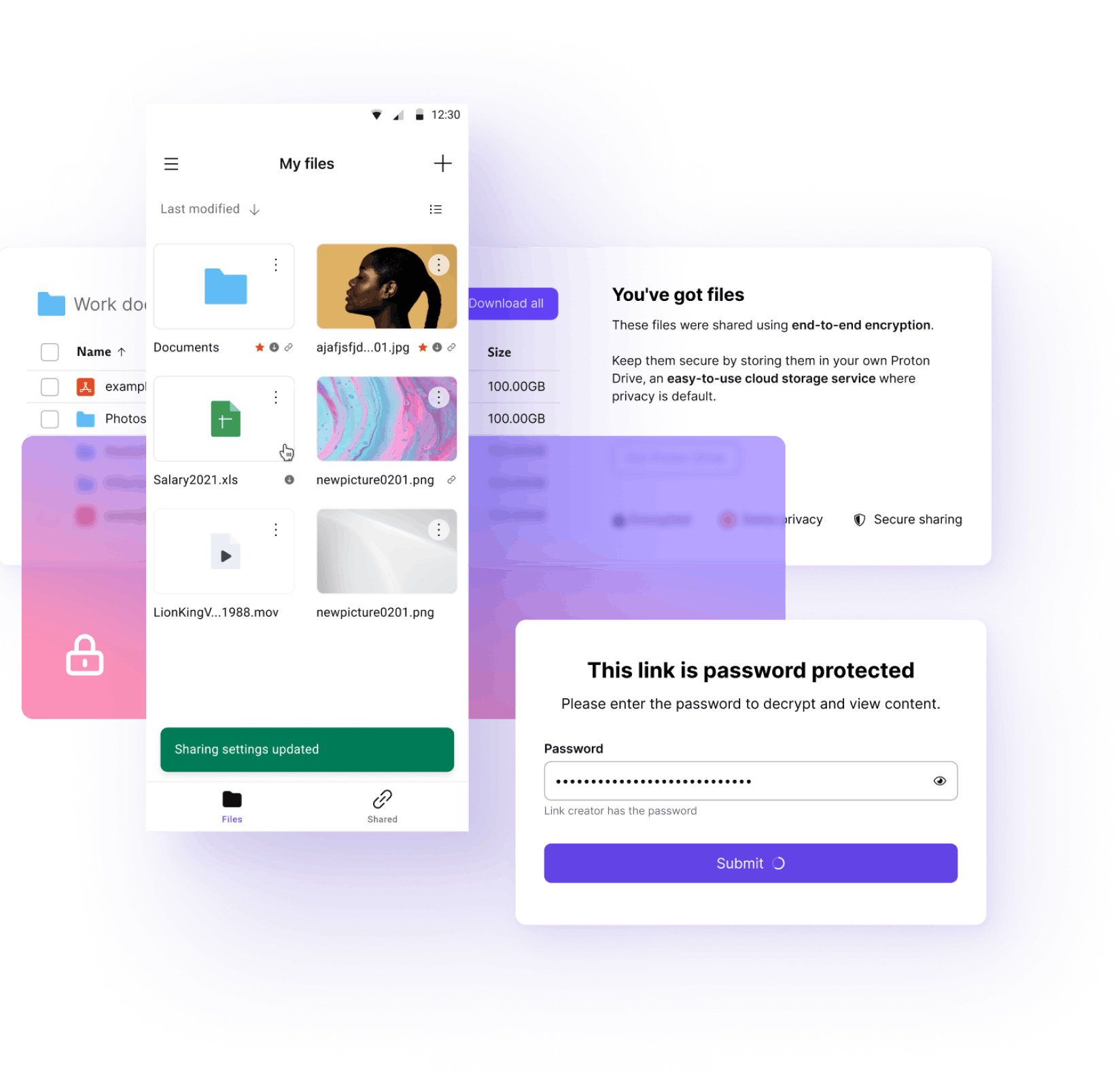 Schütze mit Proton Drive deine Dateien mit einem Passwort, um ihnen eine zusätzliche Sicherheitsebene zu geben. Mit Proton Drive kontrollierst du, wer auf deine geteilten Dateien zugreifen kann.