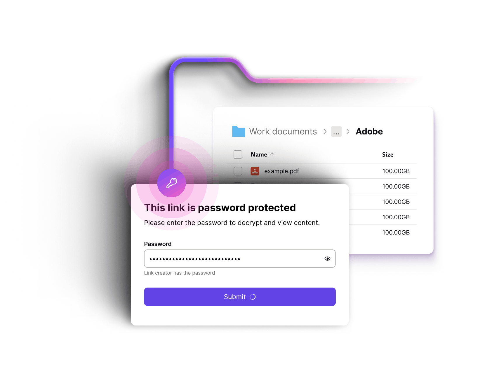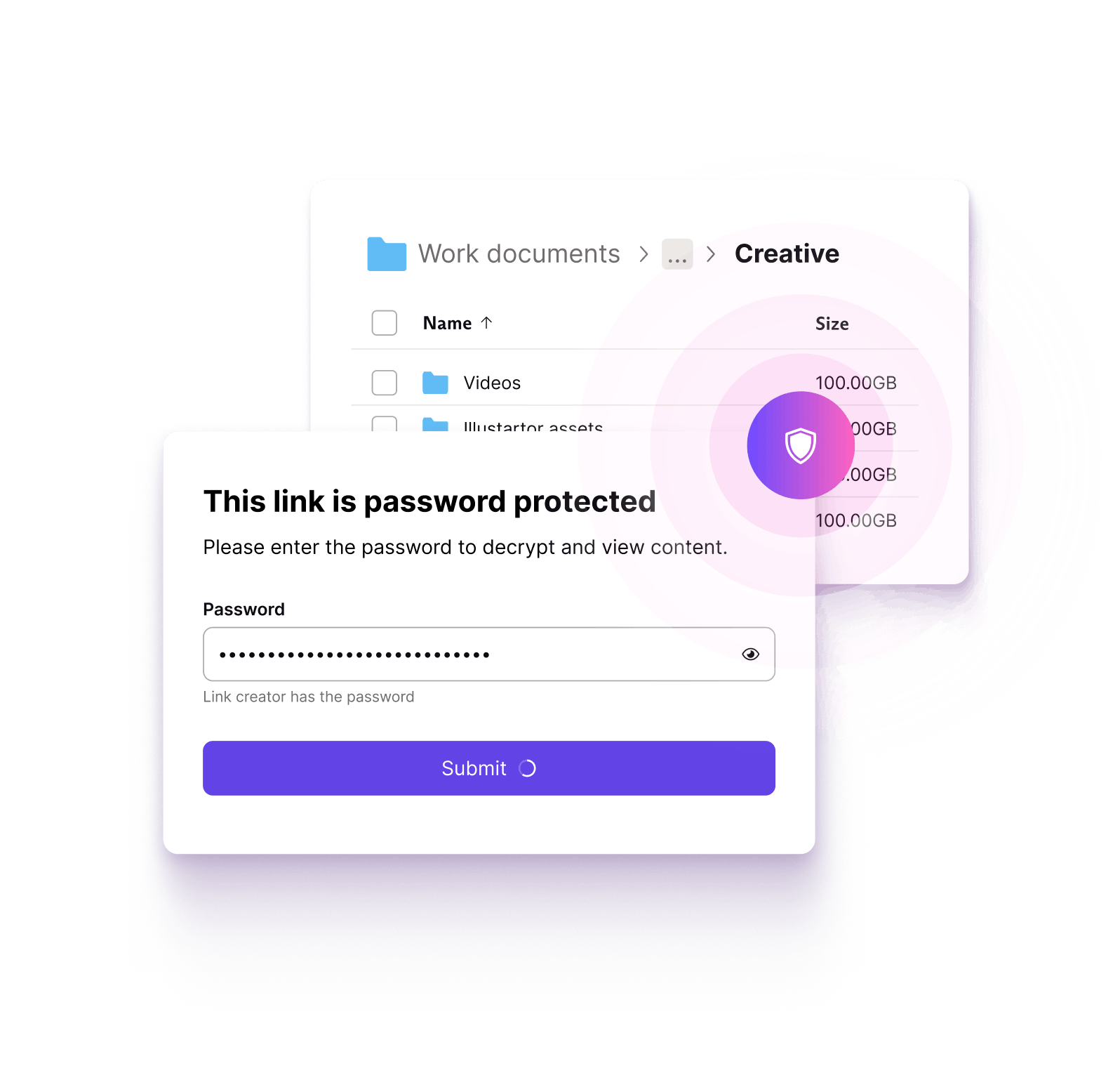 Wenn du mehrere Dateien auf einmal teilen musst, kannst du einen passwortgeschützten Ende-zu-Ende-verschlüsselten Dateifreigabelink für ganze Ordner erstellen. Wenn du ein Passwort zu einem Ordner hinzufügst, sind alle Dateien in diesem Ordner mit der gleichen zusätzlichen Sicherheitsebene geschützt. Wie bei geteilten Dateien kannst du den Zugriff auf deine geteilten Ordner jederzeit widerrufen.