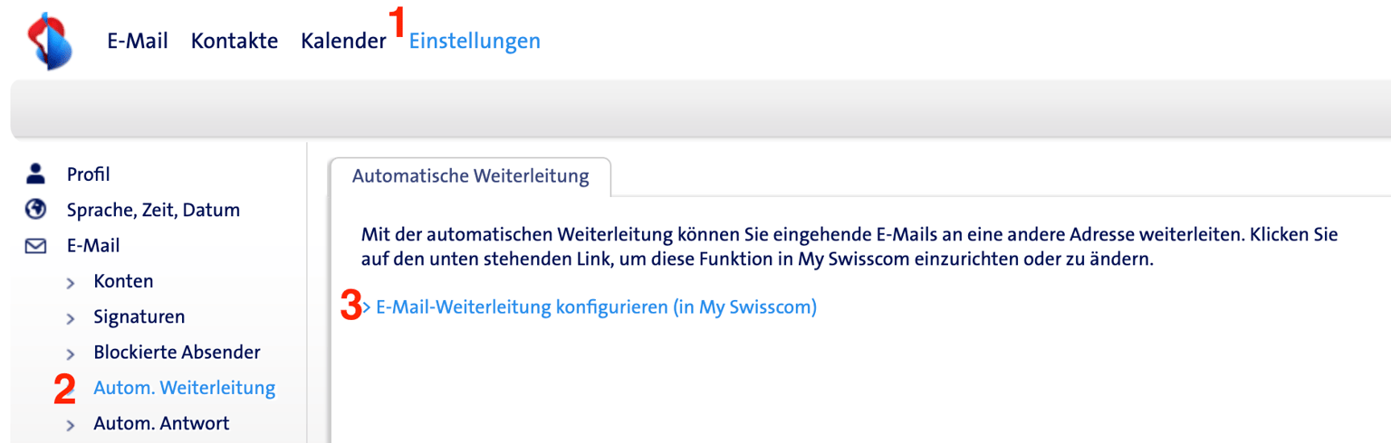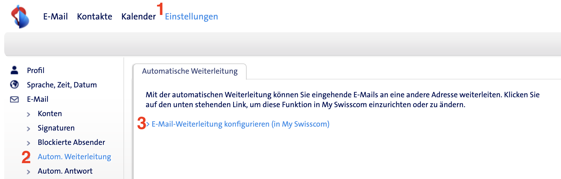 Wenn Sie Ihre Bluemail-Adresse für einige Zeit behalten möchten und E-Mails, die an Ihre Bluemail-Adresse gerichtet sind, automatisch an Proton Mail weiterleiten lassen wollen, müssen Sie die automatische Weiterleitung in Bluewin einrichten.
