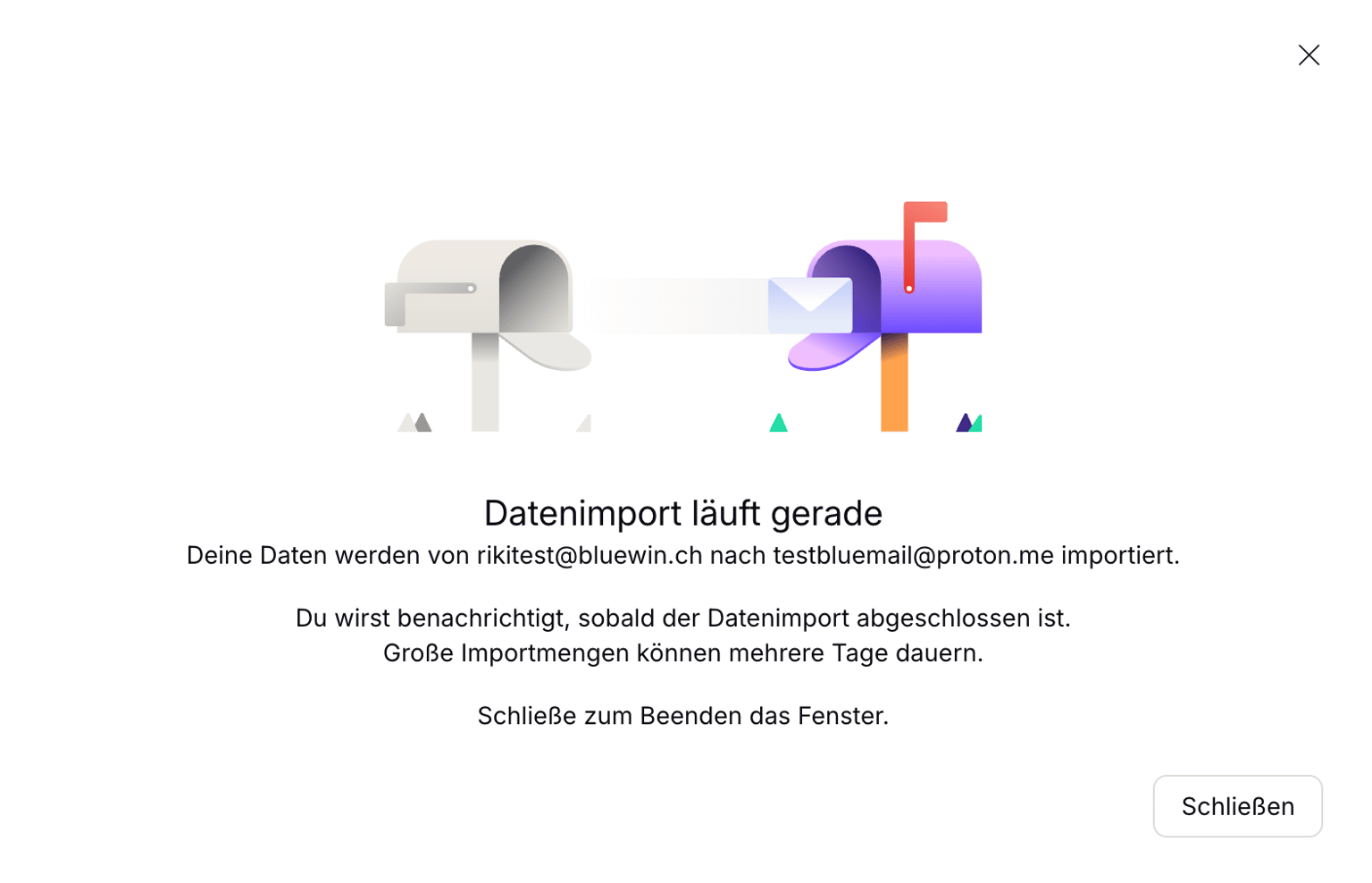 8. Der Import Ihrer E-Mails wird nun gestartet und kann je nach Grösse Ihres Postfachs bis zu einigen Stunden dauern. Sie können den Bildschirm "Der Import läuft" schliessen, Ihre E-Mails werden weiterhin automatisch importiert. Sie erhalten eine E-Mail, sobald der Import abgeschlossen ist.