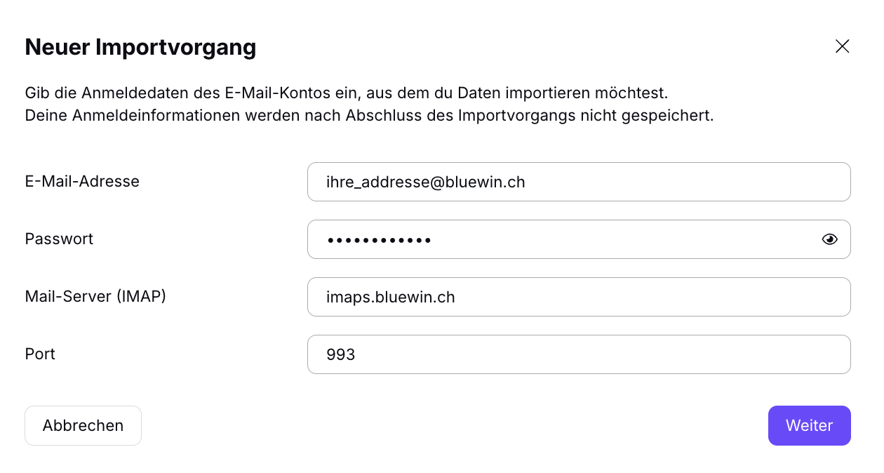 c. E-Mail-Server (IMAP): imaps.bluewin.ch