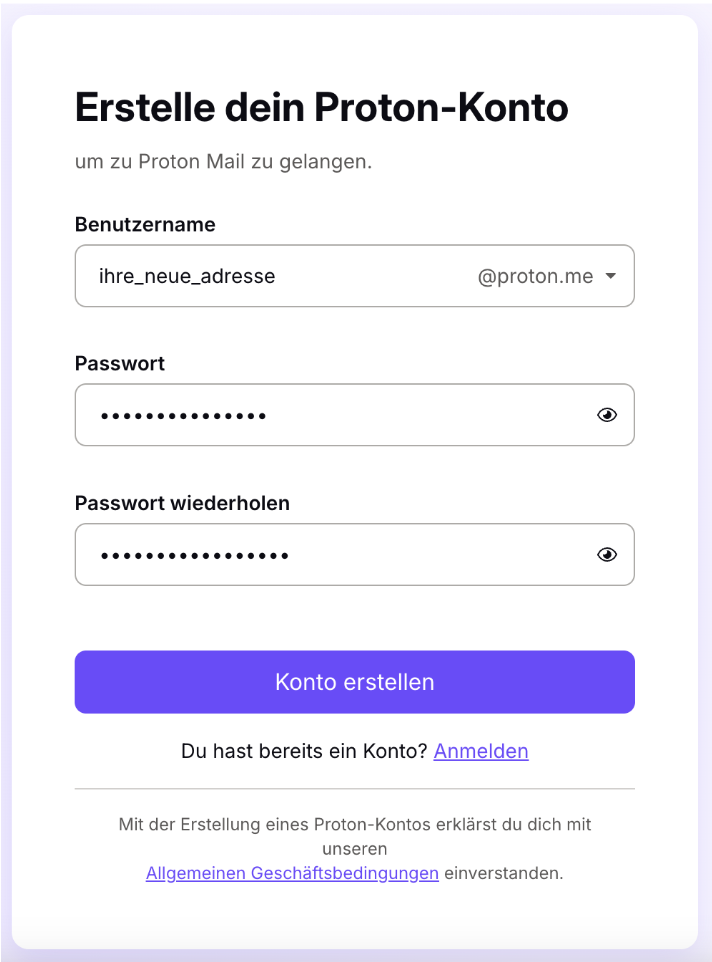 - Klicken Sie hier, um ein kostenloses Proton Mail-Konto zu erstellen. Wählen Sie eine E-Mail-Adresse und ein Passwort Ihrer Wahl.