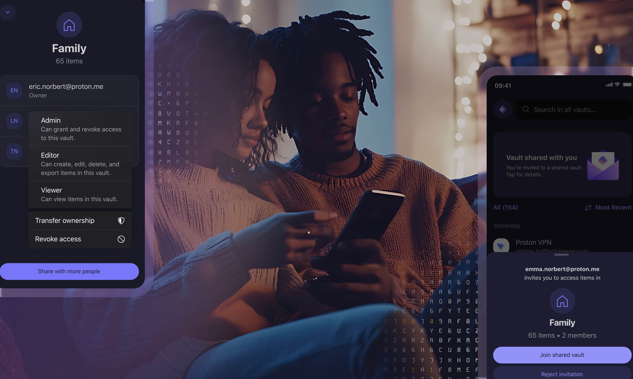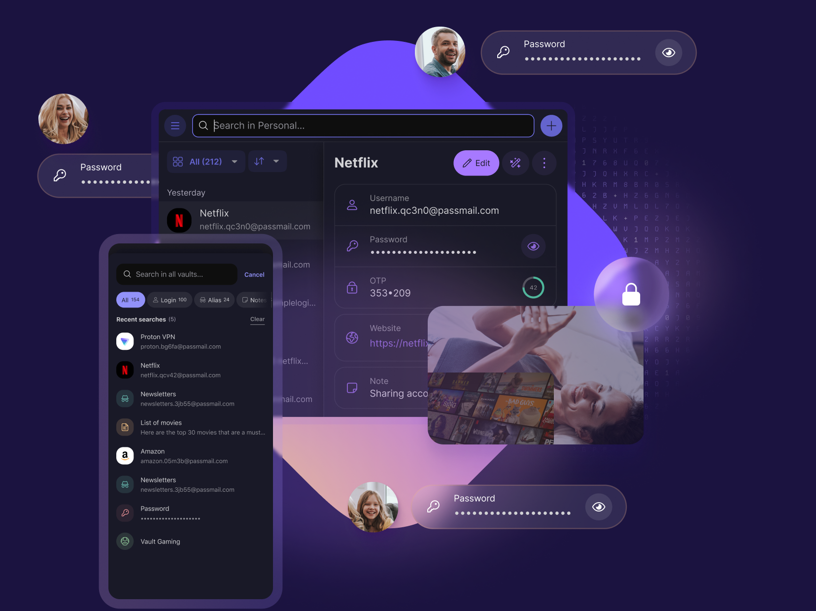 Teile einfach sicher über gemeinsame Tresore – bestimme, wer Zugriff auf deine Passwörter, Bankdaten oder Streaming-Anmeldedaten hat.