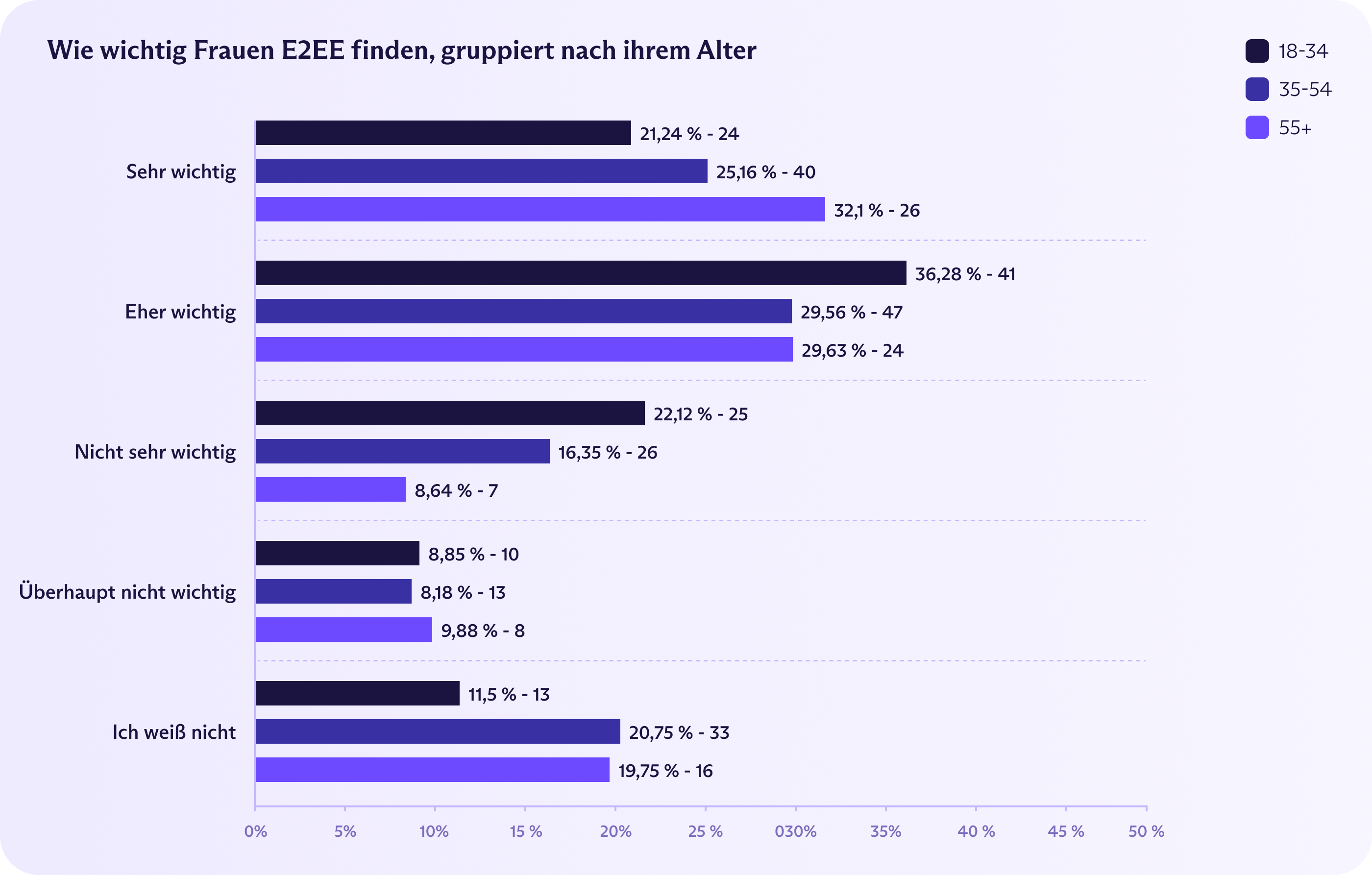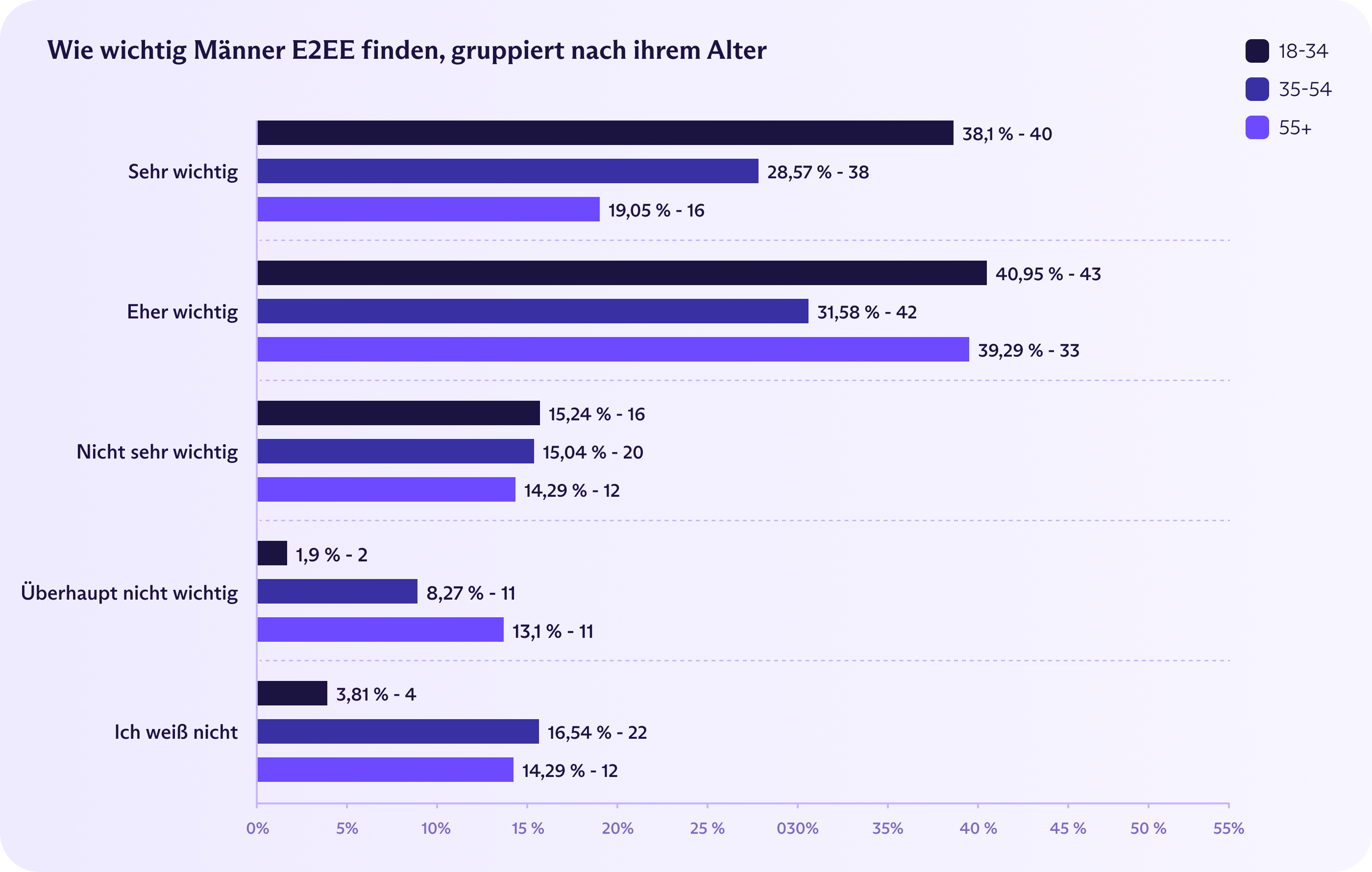 Es gab große alterabhängige Unterschiede dabei, was die Bedeutung betrifft, die die Befragten E2EE beimaßen. Junge Männer sind die Vorreiter für E2EE in Frankreich – 38 % der Männer im Alter von 18 bis 34 Jahren sagen, es sei „sehr wichtig“. Am anderen Ende der Skala bezeichneten nur 19 % der Männer ab 55 Jahren E2EE als sehr wichtig. Frauen im Alter von 18 bis 34 Jahren zeigten ebenfalls relativ wenig Begeisterung, wobei nur 21 % es als sehr wichtig einstuften. Alle anderen Bevölkerungsgruppen liegen zwischen 25 und 32 %.