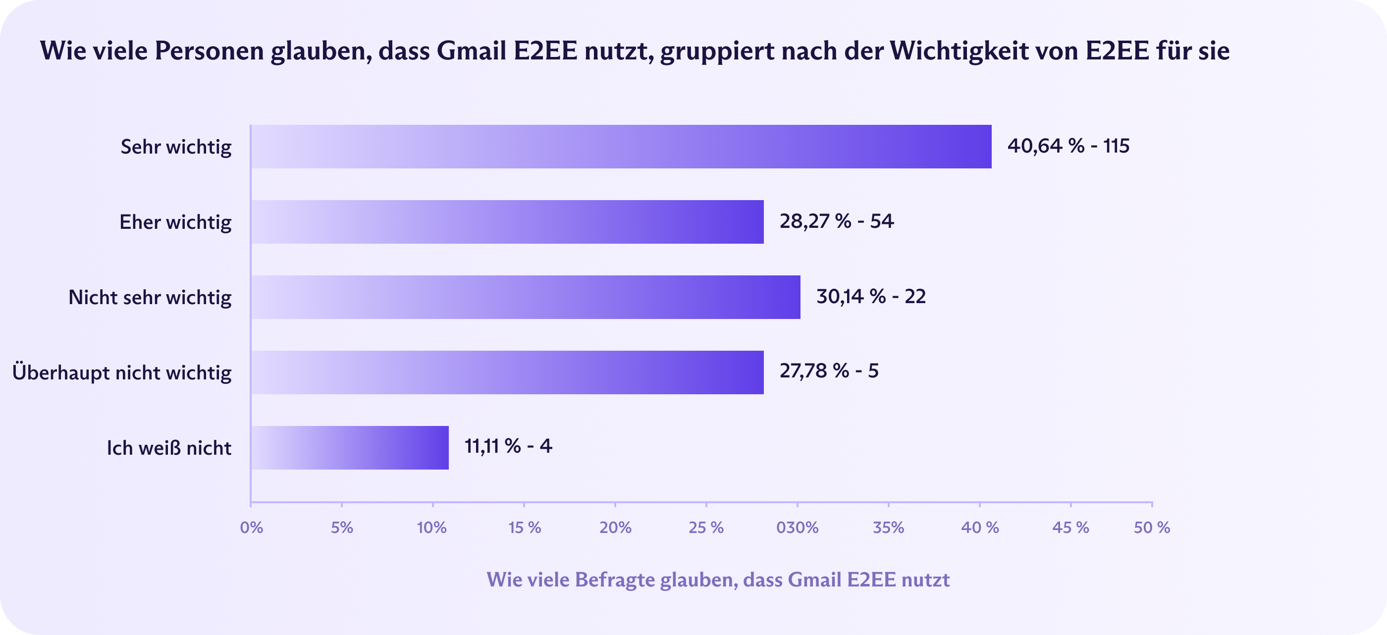 Google profitierte stark von den falschen Vorstellungen der Öffentlichkeit über Sicherheit und Privatsphäre. Menschen, die E2EE für sehr wichtig halten, gaben tatsächlich eher an, dass Gmail E2EE verwendet, als der Durchschnitt in unserer Umfrage (45 % gegenüber 33 %). Dieselbe Gruppe stufte Gmail auch eher als privat ein: 30 % bezeichneten Gmail als „sehr privat“ und weitere 34 % gaben an, es sei „eher privat“.