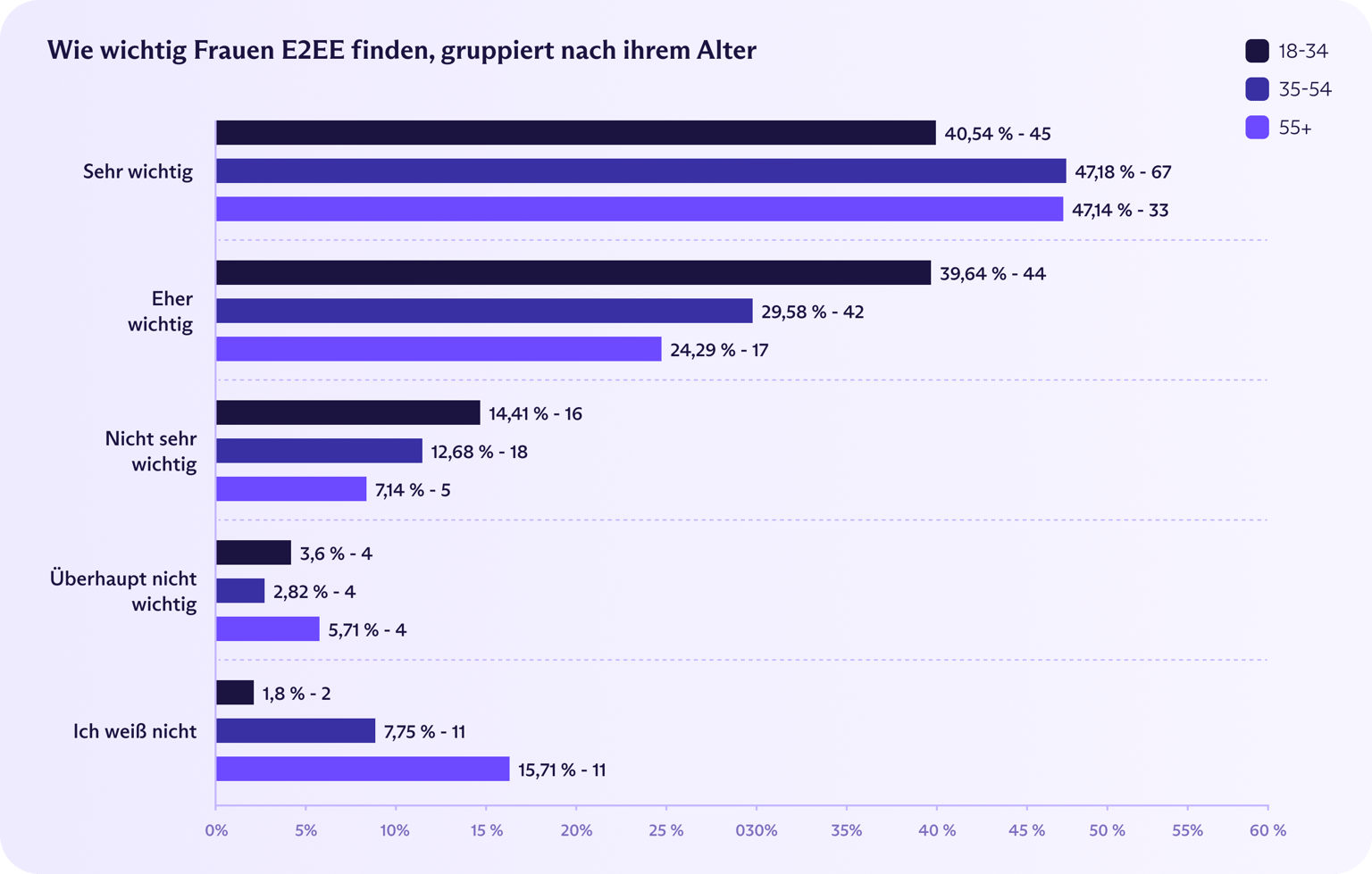 Allerdings gaben 47 % der Frauen zwischen 35 und 54 Jahren und der Frauen über 55 an, dass E2EE wichtig sei, deutlich mehr als Männer über 55 (37 %) oder Frauen unter 34 (41 %).