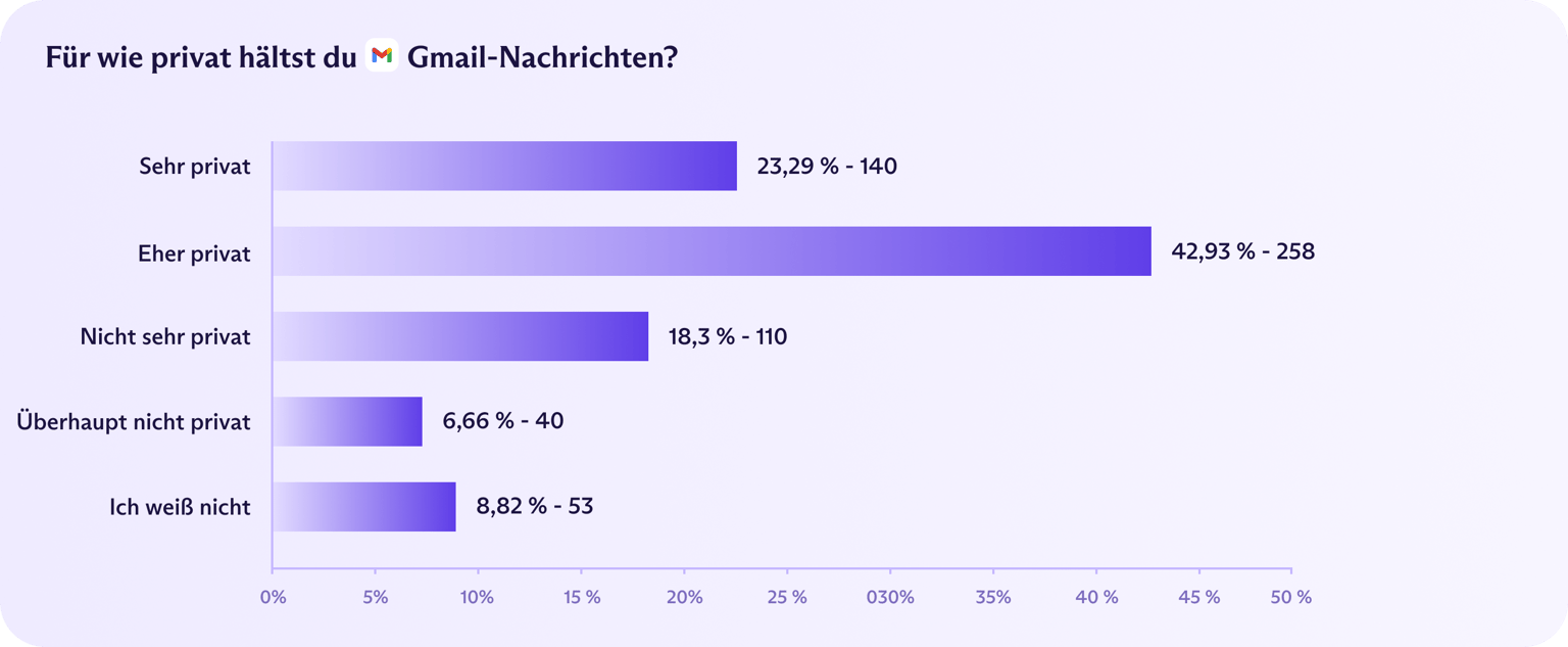 Tatsächlich waren die Deutschen am zufriedensten mit den Schutzmaßnahmen für die Privatsphäre bei Gmail. Insgesamt glauben 66 % der Deutschen, dass ihre Gmail-Nachrichten „sehr“ oder „eher privat“ seien – das höchste Vertrauensniveau unter den untersuchten Ländern, gefolgt von den USA mit 61 % und Großbritannien mit 57 %. Ironischerweise hat das Land, das das geringste Vertrauen in E2EE setzt, Frankreich, auch das geringste Vertrauen in Gmail: Nur 48 % der französischen Befragten gaben an, dass ihre Nachrichten zumindest eher privat seien.