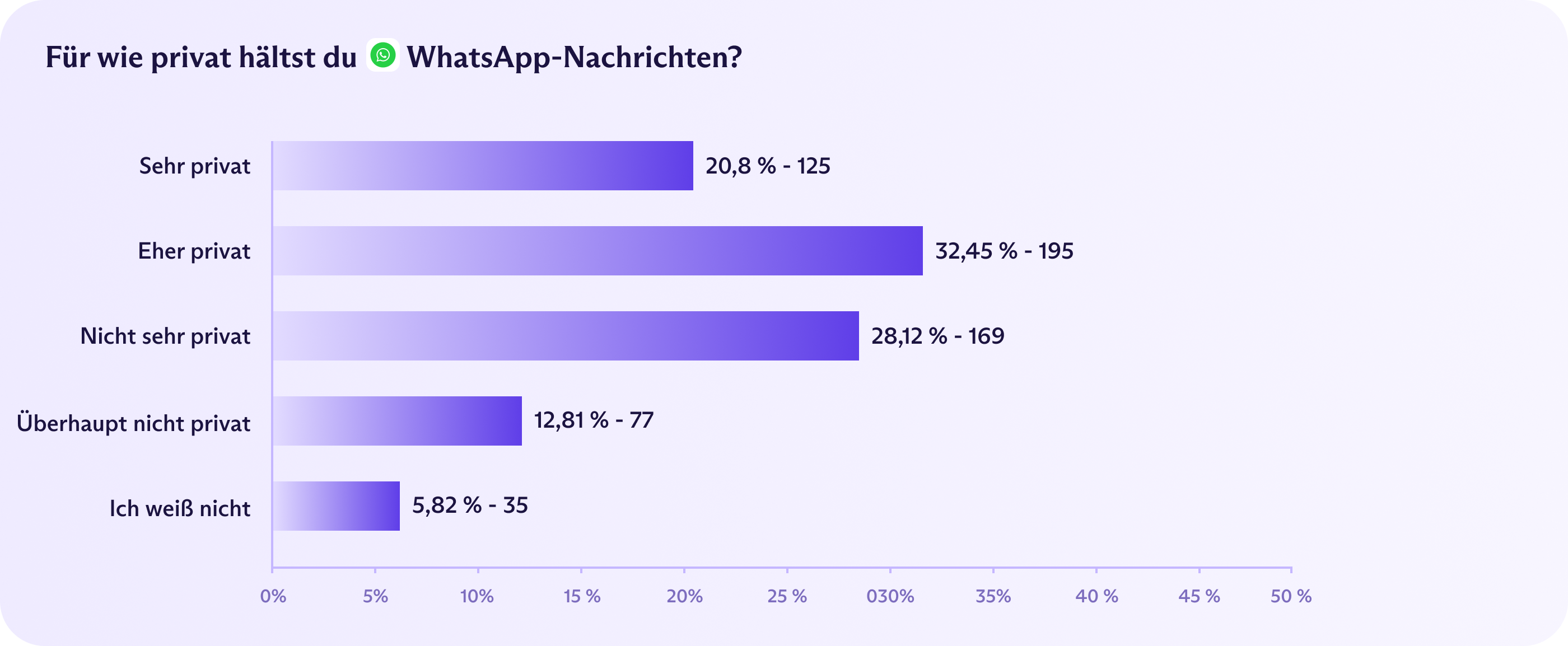 Trotz dieser Fakten gaben 53 % der Deutschen immer noch an, WhatsApp sei „sehr privat“ oder „eher privat“, und nur 51 % sagten, sie würden einen Wechsel zu einem privateren Messaging-Dienst in Betracht ziehen.