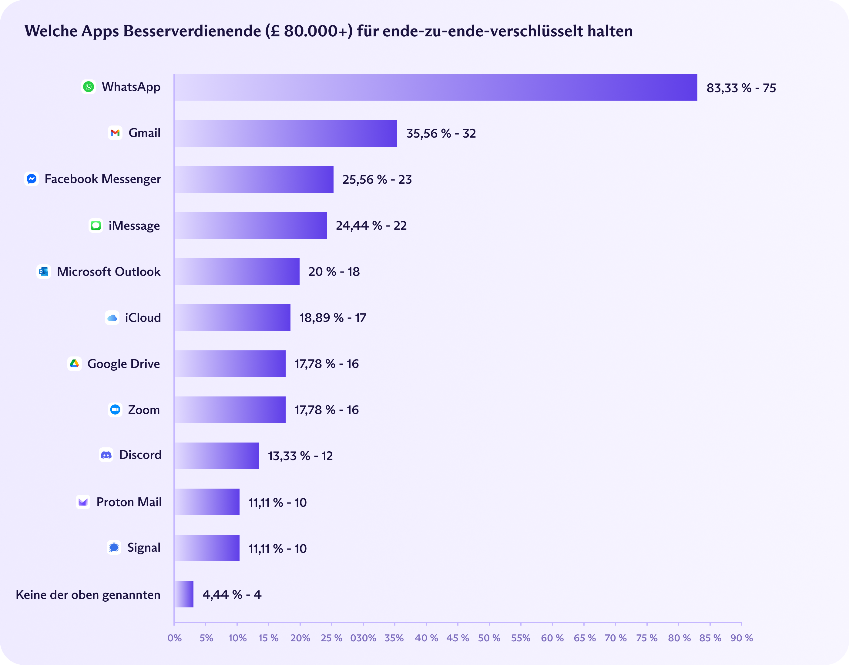Die Umfrageteilnehmer vertrauten weitaus eher bekannten Plattformen als solchen, die speziell für die Privatsphäre entwickelt wurden. Nur 10 % der Briten erkannten, dass Signal, eine der sichersten verfügbaren Messaging-Apps, E2EE anbietet. Proton Mail schnitt mit nur 9 % noch schlechter ab.