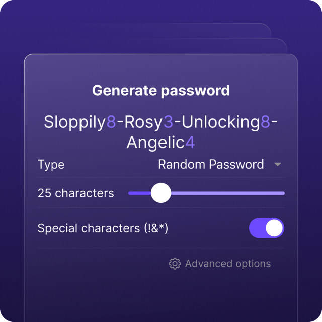 - Er sollte dir die Möglichkeit bieten, zwischen zufälligen Passwörtern und Passphrases zu wählen. Eine Passphrase wie Schludrig8-Rosi3-Entsperren8-Engelsgleich4 setzt sich aus unzusammenhängenden Wörtern zusammen und lässt sich leichter eingeben und merken. Dies ist hilfreich für Apps, bei denen du dein Passwort eingeben musst, oder auf Websites zur Wiederherstellung von Konten.