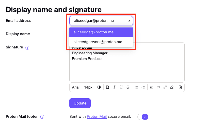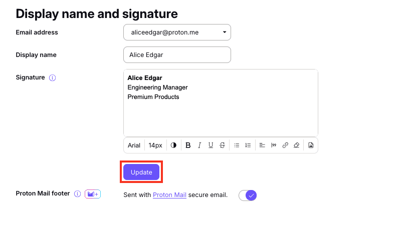 2. In the Display name and signature section, enter your display name and email signature and click Update.